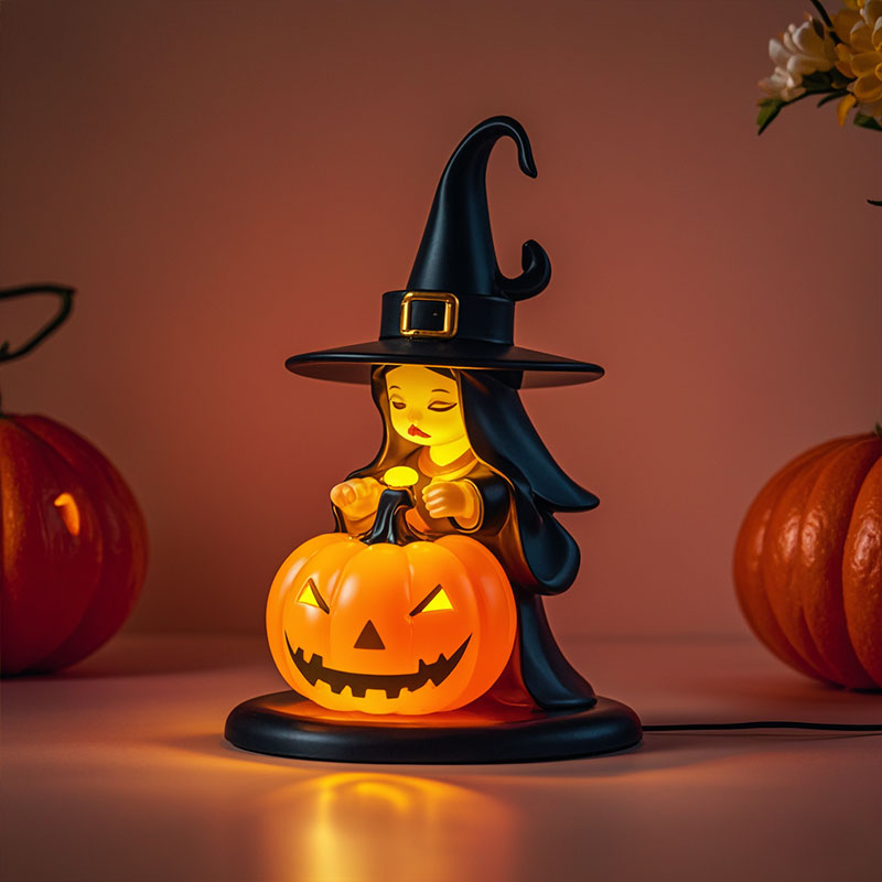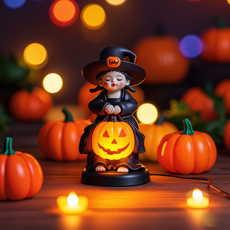 東莞廠家定制萬圣節(jié)氛圍擺件南瓜巫女燈pvc塑膠人偶手辦桌面擺件